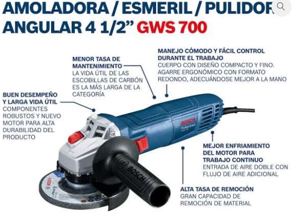 El Esmeril Bosch GWS 700 tiene 710W de potencia y es una herramienta liviana, con bajo costo de mantenimiento, ya que su motor tiene una larga vida útil de las escobillas de carbón. Su diseño es optimizado y tiene una empuñadura ergonómica. El Esmeril Bosch GWS 700 tiene entradas de aire redobladas para una mejor refrigeración de la máquina.
