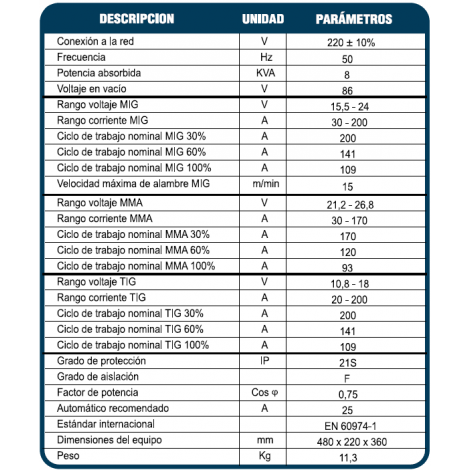 El equipo COMPACTMIG 200, es un equipo electrónico con tecnología inversora, diseñados para uso semi-industrial, se caracteriza por incluir tres procesos de soldadura, MIG, MMA (Arco manual) y TIG